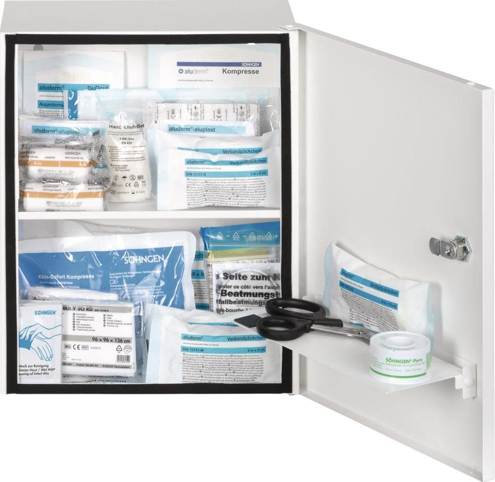 Lieferumfang: 1 Erste Hilfe Füllung DIN 13157 , 2 x Schlüssel, Befestigungsmaterial