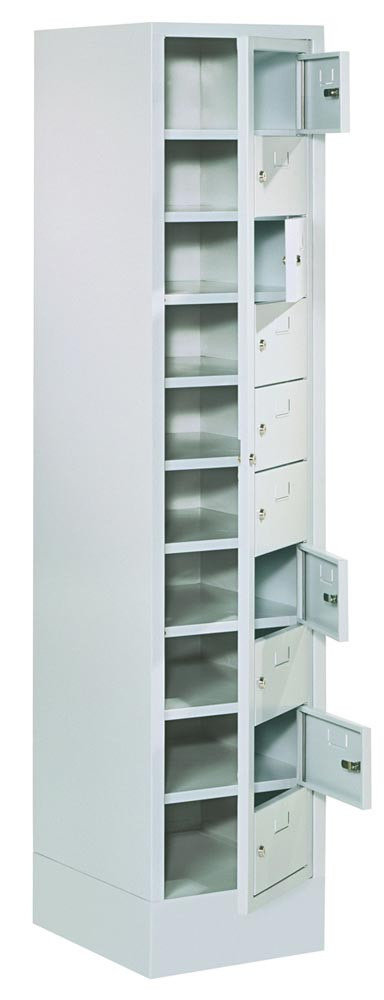 Wäscheschrank, Sockel, 10 Fächer und Haupttür mit Zylinderschloss, BxTxH 400x 500x1850 mm, RAL 7035/5010 E1568115