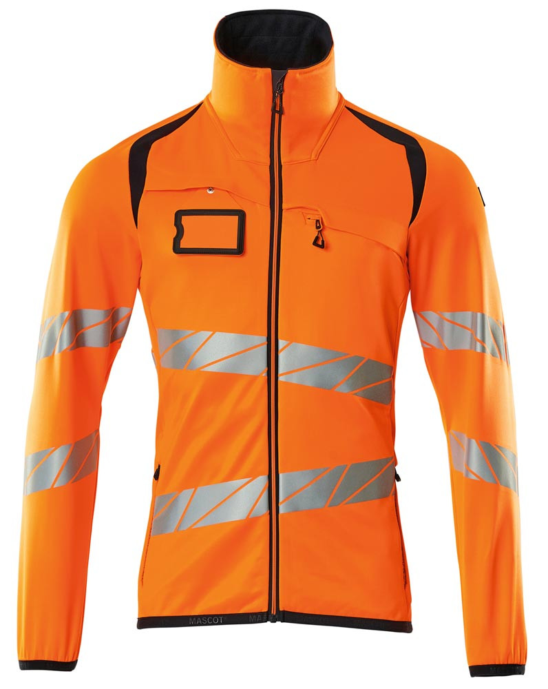 Nach EN ISO 20471 - Klasse 2 und Hi-Vis Gruppe A ∙ Aus 94% Polyester/6% Elasthan, ca. 260 g/m2 ∙ Fluoreszierend und mit schrägverlaufenden Reflexen ∙ Moderne, körpernahe Passform mit viel Bewegungsfreiheit ∙ Stehkragen ∙ Zweifarbig ∙ Verschluss mit Reißverschluss und inwendiger Wetterschutzleiste ∙ Brusttasche mit Reißverschluss ∙ Vordertaschen mit Reißverschluss ∙ Innentaschen ∙ Gummizug an den Handgelenken und in der Unterkante ∙ Abnehmbarer ID-Kartenhalter ∙ Für Industriewäsche-Kategorie C2 geeignet ∙Zertifiziert nach OEKO-TEX® Standard 100 ∙ Farbe Hi-Vis orange/schwarzblau