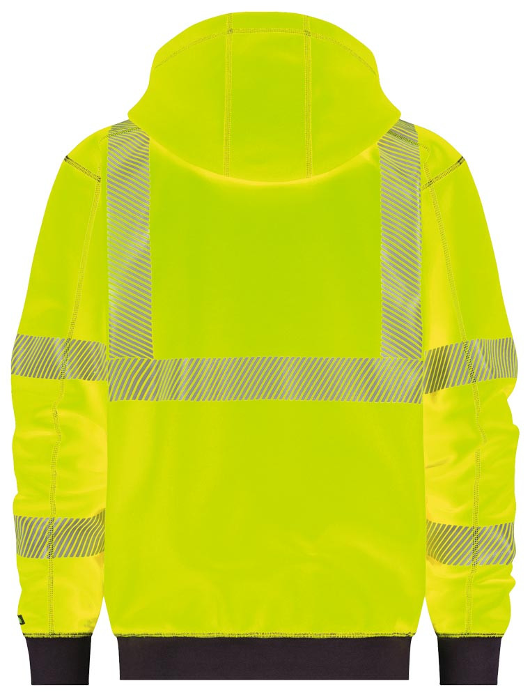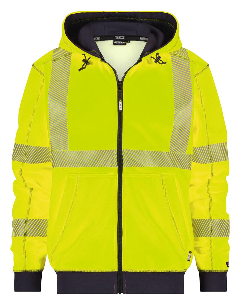Nach EN ISO 20471:2013+A1:2016, Klasse 2 (Gr. XS+S) bzw. EN ISO 20471:2013+A1:2016, Klasse 3 (Gr. M-4XL) ∙ Aus 65% Polyester/35% Baumwolle, ca. 280 g/m2 ∙ Kapuzensweatshirt in fluoreszierenden Farben ∙ Mit langem Reißverschluss und 2 sicheren Taschen mit Reißverschluss ∙ Zweilagige Kapuze mit elastischem Kordelzug ∙ Segmentierte Reflexstreifen von 50 mm ∙ Ärmelbündchen und Bund aus Strick ∙ Stickerei in Kontrastfarbe ∙ OEKO-TEX® Standard 100