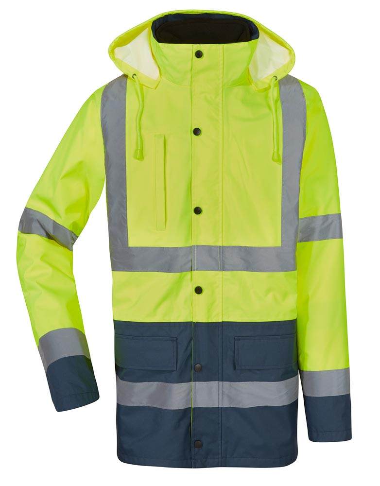 Jacke mit 4 Funktionen - Winterparka, Regenparka, Übergangsjacke und Warnweste ∙ Nach EN ISO 20471, Klasse 3, EN 343 3/1 aus 100% Polyester mit PU-Beschichtung ∙ Herausnehmbare Innenjacke aus 100% Polyester mit PU-Beschichtung, Futter und Ärmel aus 100% Fleece ∙ Krageninnenseite in marine abgesetzt ∙ Mit verdeckter Reißverschlussleiste ∙ Ärmel der Innenjacke abtrennbar ∙ Mit integrierte Kapuze ∙ 2 Seitentaschen mit Patte ∙ Am Rumpf und beiden Ärmel umlaufende silber Reflextreifen 2 x 5 cm sowie über den Schultern