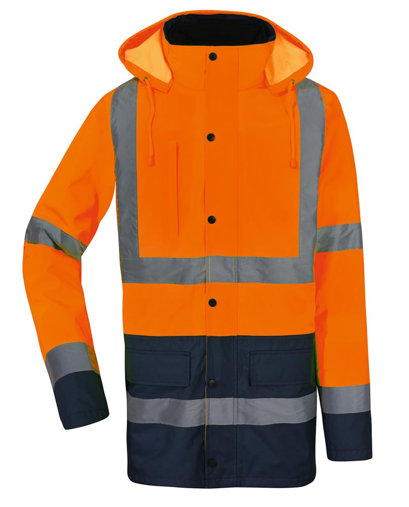 Jacke mit 4 Funktionen - Winterparka, Regenparka, Übergangsjacke und Warnweste ∙ Nach EN ISO 20471, Klasse 3, EN 343 3/1 aus 100% Polyester mit PU-Beschichtung ∙ Herausnehmbare Innenjacke aus 100% Polyester mit PU-Beschichtung, Futter und Ärmel aus 100% Fleece ∙ Krageninnenseite in marine abgesetzt ∙ Mit verdeckter Reißverschlussleiste ∙ Ärmel der Innenjacke abtrennbar ∙ Mit integrierte Kapuze ∙ 2 Seitentaschen mit Patte ∙ Am Rumpf und beiden Ärmel umlaufende silber Reflextreifen 2 x 5 cm sowie über den Schultern