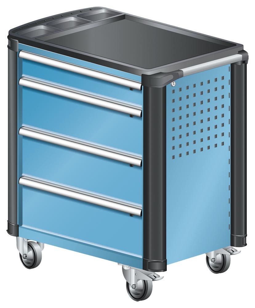 ∙ Aus hochwertigem, pulverbeschichteten Stahlblech ∙ Stabiles, geschweißtes Stahlblechgehäuse mit 400 kg Traglast ∙ 2 Bock- und 2 Lenkrollen mit Feststeller, aus Vollgummi, Ø 100 mm ∙ Schublade mit Vollauszug und einer Traglast von je 40 kg ∙ Zentralverschluss und Schubladeneinzelsicherung gegen ungewolltes Öffnen im Fahrbetrieb ∙ Stabile und ergonomisch geformte Schiebestange ∙ B x T x H 894 x 525 x 928 mm