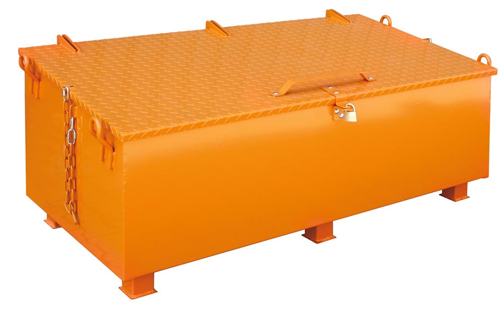 · Robuste, geräumige Werkzeugkiste aus Stahlblech · Standfüße vermeiden eine Kontaktkorrosion und garantieren ein leichtes Einfahren mit Gabelstapler und Hubgeräten · Traglast bis 800 kg· Serienmäßig mit 4 Haken für den Transport mit einem Kran · Der Deckel ist aus Riffelblech und Ösen für ein Vorhängeschloss versehen