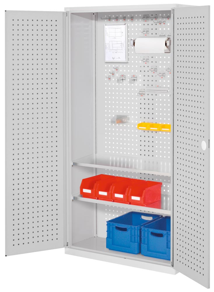 Werkzeugschrank, Türen mit Lochplatten, BxTxH 1000x410x1950 mm, 2 Fachböden, RAL 7035 E863585