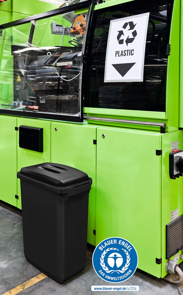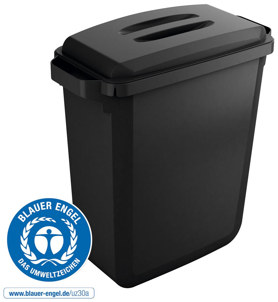 · Zum Sammeln und Trennen von Abfällen und Wertstoffen · Mit robusten Tragegriffen für einfachen Transport · Haltevertiefungen auf der Bodenunterseite zum sicheren Entleeren · Mit Klemmschlitzen für Abfallsäcke · Deckel mit Griffmulde für leichtes Abnehmen · Einsatz recycelter Kunststoffe in Blauer Engel Qualität · Nicht lebensmittelgeeignet · Volumen 60 Liter · B x T x H 590 x 282 x 645 mm