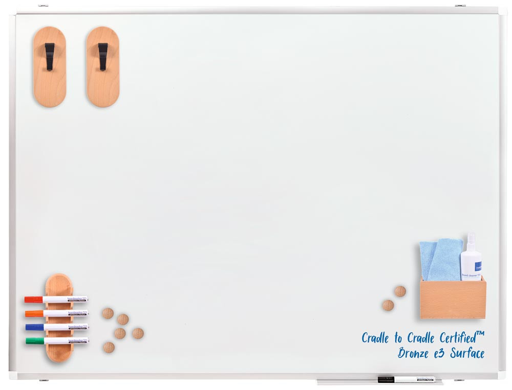 ∙ Ultrawiderstandsfähige und umweltfreundliche Emaille-Tafeloberfläche ∙ Beschriftung lässt sich auch nach längerer Zeit noch gut abwischen ∙ Auch falsch eingesetzte Marker (z. B. Permanentmarker) lassen sich ohne Oberflächenbeschädigung entfernen · Board zu 99 % recyclebar, 50% der Komponenten bestehen aus recycletem Material