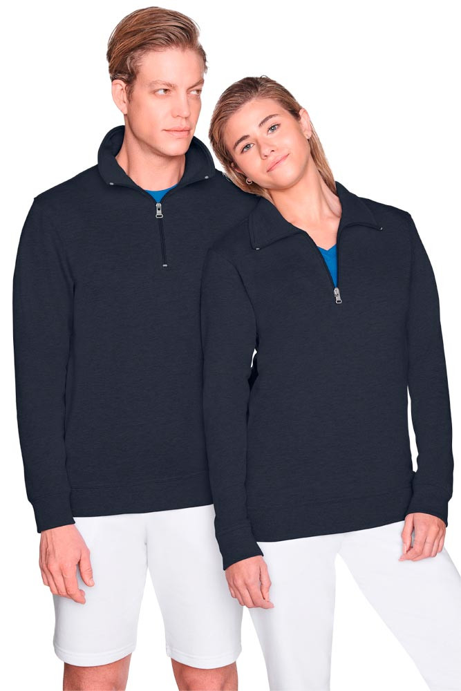 Wirkware aus 70% gekämmter Baumwolle/30% Polyester (grau-meliert: 60% Polyester/40% Baumwolle), ca. 300 g/m2 ∙ Zip-Sweat mit LYCRA®-Anteil verstärkten Bündchen ∙ Doppelnahtverarbeitung ∙ YKK®-Reißverschluss ∙ Gewebtes Flaglabel an der linken Seitennaht ∙ Waschbar bis 60 ºC ∙ Einlaufvorbehandelt