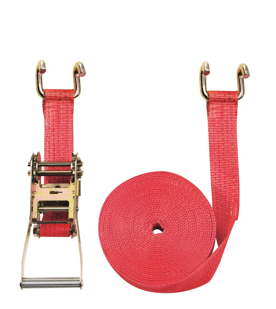 Zweiteiliger Zurrgurt, mit Rahmenhaken, 5000 daN zul. Zugkraft in der Umreifung, Gurtbreite 50 mm, Länge 4 m, Farbe rot, 5 Streifen, VE 2 Stück E838134